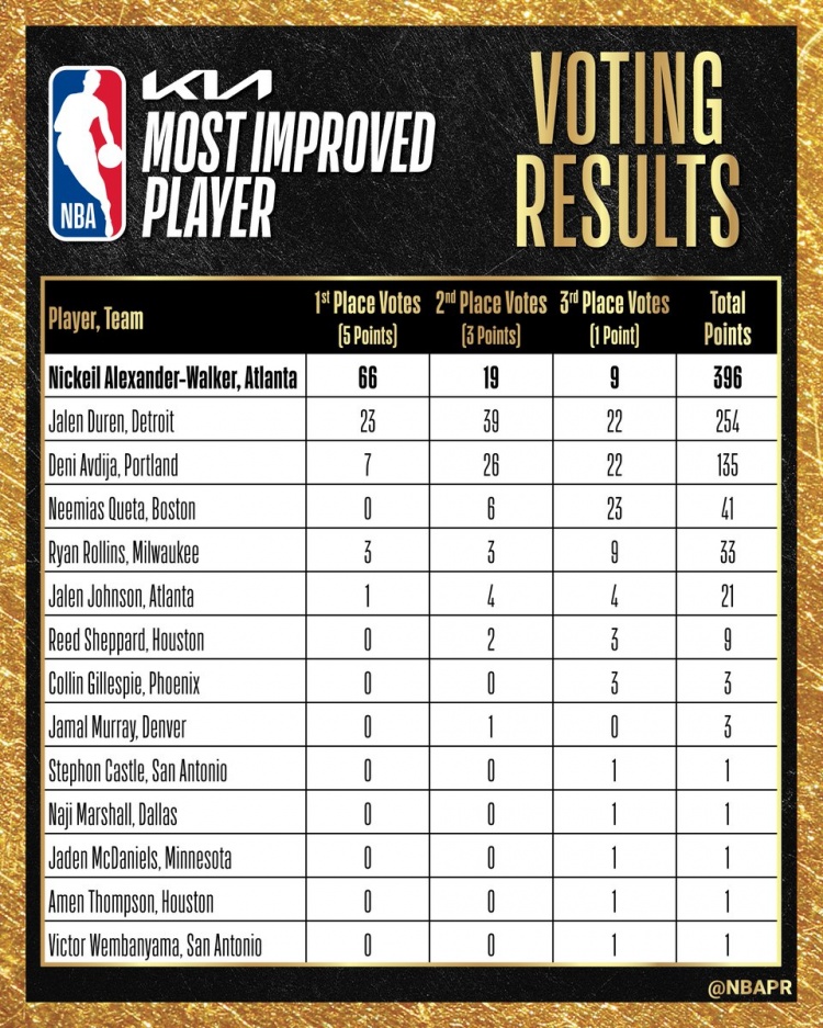 4月25日讯 今日NBA官方宣布,亚特兰大老鹰后卫尼基尔·亚历山大-沃克当选本赛季最快进步球员。